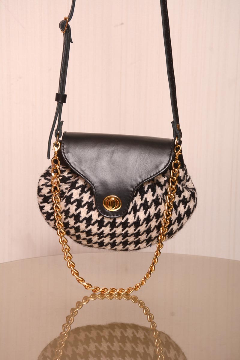 Bolsa em Tweed preto e branco com couro preto, alça regulável e corrente especial removível, zíper e forro interno.