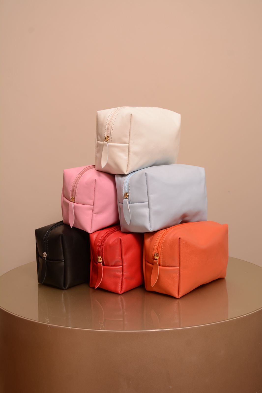 Nécessaire personalizada em couro nas cores vermelha, rosa, preta, laranja, dourada, azul claro e off.