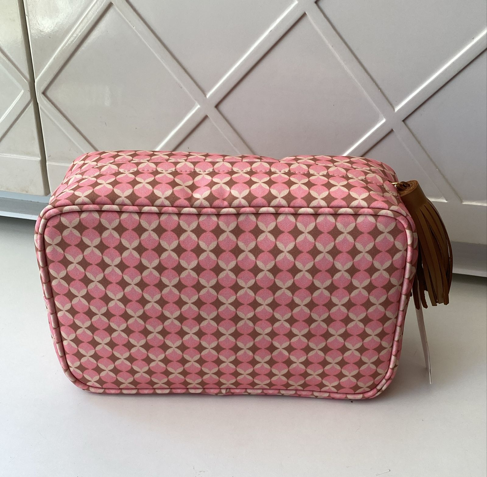 Nécessaire personalizada em couro com estampa losango em cobinações variadas.